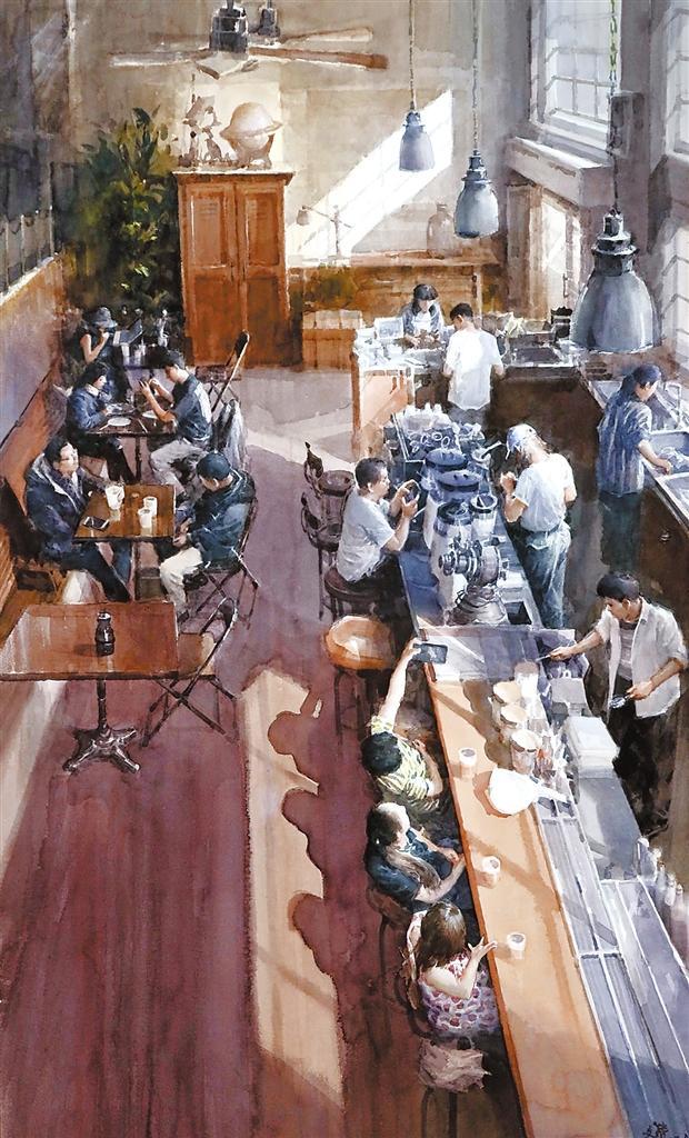 《網(wǎng)紅咖啡館的午后》用寫(xiě)實(shí)方法展現(xiàn)了一個(gè)溫馨的生活場(chǎng)景。在構(gòu)圖上,以俯視的角度用大場(chǎng)景來(lái)做整體畫(huà)面的籌劃,在整體色調(diào)上以沉穩(wěn)厚重的暖色作為基調(diào),把光線(xiàn)穿插、引入到畫(huà)面中。在布局上,以陽(yáng)光照耀下的咖啡館吧臺(tái)為主要表現(xiàn)組群,分別刻畫(huà)、塑造了工作中的前臺(tái)人員、打卡拍照的女性顧客群;把暗部區(qū)域,幾組在咖啡桌邊交談、用餐、喝咖啡的顧客群作為第二層次,展現(xiàn)他們不同的神情和體態(tài);然后完善整體的空間感。在用筆上盡量以松動(dòng)的筆觸,又能展現(xiàn)細(xì)節(jié)的方式來(lái)塑造,利用水彩畫(huà)需要干、濕、松、緊相結(jié)合,多層次、多遍數(shù)進(jìn)行渲染的特性,盡可能達(dá)到預(yù)期效果。 (本版文圖由甘肅省美術(shù)家協(xié)會(huì)提供)