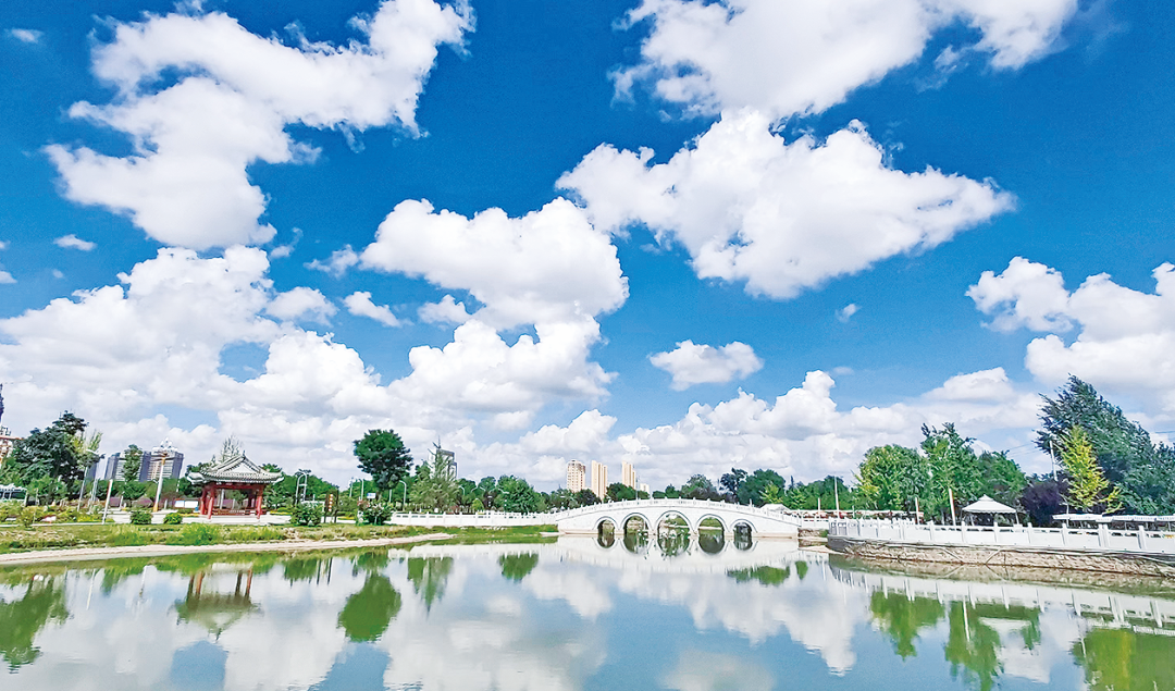 珍臺(tái)巨館,表山川之勝境;璇題繡甍,壯城邑之偉觀。登臨目送,廣胸中之丘壑;吊古尋幽,探物外之文章。蒲河馬蓮,二水銜董志大塬;沃野平疇,厚土載隴東糧倉(cāng)。葳蕤子午,松濤巖瀑,丹崖翠壁,佳木秀而繁蔭;氤氳太白,鳶飛魚躍,碧落霞天,美譽(yù)隴上江南。晴空如洗,云收崆峒之谷;雁陣橫空,雪霽調(diào)令之關(guān)。高塬平湖,筑黃土以為壩;潛龍騰淵,劈崇山而成渠。