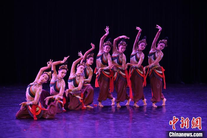 9月6日,由甘肅省人民政府臺(tái)灣事務(wù)辦公室、西北民族大學(xué)聯(lián)合舉辦的“‘尋甘同味·舞樂(lè)敦煌’第七屆臺(tái)灣大學(xué)生敦煌文化研習(xí)營(yíng)”結(jié)營(yíng)式在甘肅蘭州西北民族大學(xué)舉行。來(lái)自臺(tái)灣中國(guó)文化大學(xué)、臺(tái)灣藝術(shù)大學(xué)、臺(tái)灣體育運(yùn)動(dòng)大學(xué)與西北民族大學(xué)的65名師生在結(jié)營(yíng)式上,合作進(jìn)行了舞蹈音樂(lè)創(chuàng)作成果展演,展示了傳統(tǒng)與現(xiàn)代舞蹈的完美融合。圖為當(dāng)日進(jìn)行的舞蹈音樂(lè)創(chuàng)作成果演出。中新社記者 李亞龍 攝