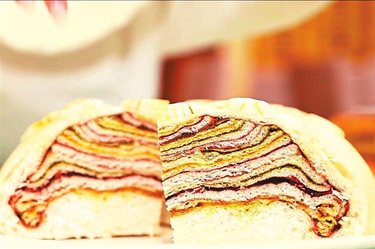 母親最拿手的還是做千層大月餅,做法與平常做饃有點(diǎn)不一樣,發(fā)好面后取適量揉好,切成同樣大小的若干份并搟壓成長(zhǎng)方形的薄面皮。一層薄皮一層餡,餡料與烙的糖饃有的不一樣,重在色澤,每層分別抹上姜黃、紅曲、苦豆(香豆)粉、芝麻、菜籽油、糖玫瑰、葡萄干,黃、紅、黑、綠相間,一層黃一層綠一層紅一層黑,一層白糖一層紅糖一層玫瑰糖,一層一層摞好,做成一個(gè)六七層的圓餅。最后用薄皮蓋住一摞摞面皮,餅邊捏緊捏好后壓花塑形,表面用模型壓花,用專用做飯梳子一行行點(diǎn)上,或一行白鷺上青天,面皮如一塊畫布,精雕細(xì)琢,怎么好看怎么做,做得隨心所欲又精心設(shè)計(jì)。還會(huì)刷姜黃與菜籽油拌好的油料,撒上芝麻粒和葡萄干,一個(gè)千層餅就基本成型了。