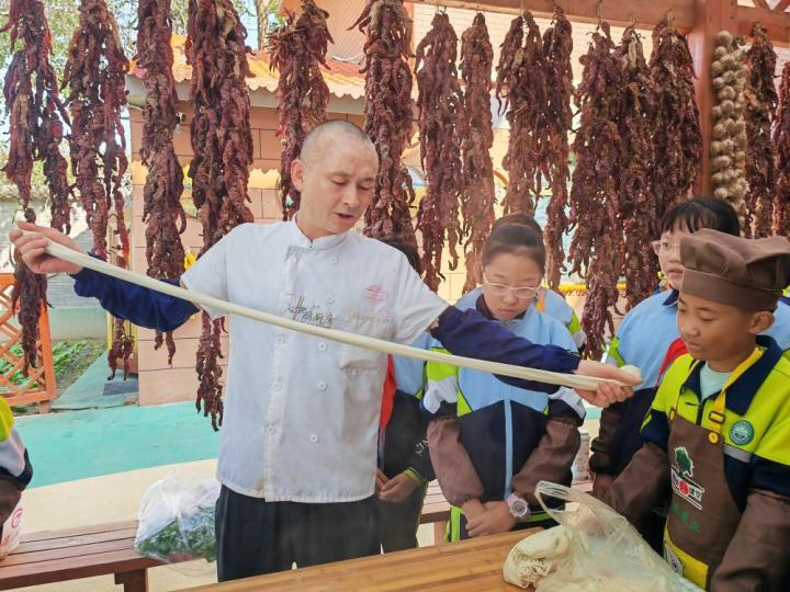 話音剛落,同學(xué)們戴上廚師帽,系好圍裙,紛紛擼起袖子嘗試制作蘭州牛肉面,他們學(xué)著老師的模樣搓制面團(tuán)、拉面條,切蒜苗……從中學(xué)習(xí)制作這一傳統(tǒng)美食的技藝。