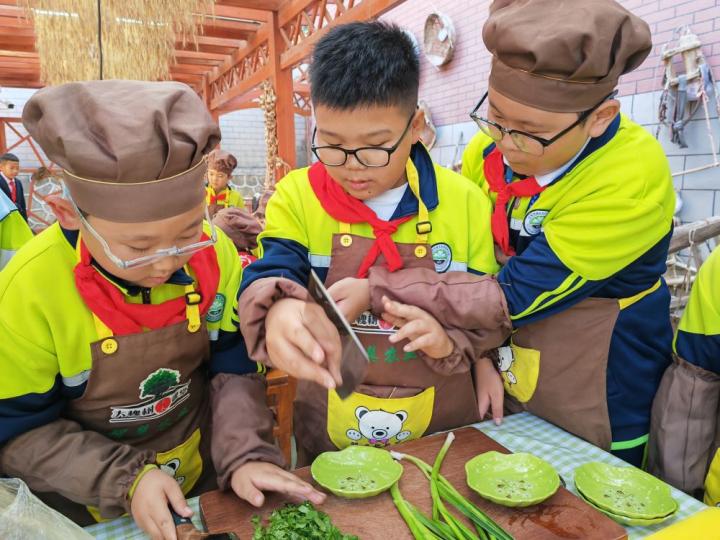 蘭州市城關(guān)區(qū)伏龍坪小學(xué)六年級(jí)1班的裴玉龍(左一)和同學(xué)們動(dòng)手嘗試切蒜苗。新華社記者 白麗萍 攝