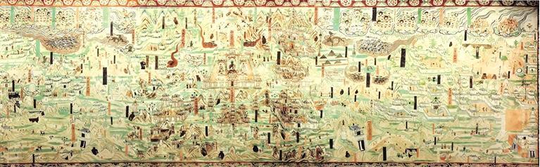 莫高窟61窟,建于五代晚期,是河西歸義軍節(jié)度使曹元忠及夫人開鑿的功德窟,又稱“文殊堂”,主要為供奉文殊菩薩而修。該窟的亮點(diǎn)是西壁的巨幅五臺山圖。這是敦煌壁畫中規(guī)模最大的山水人物圖,也是全景式歷史地圖。五臺山圖長13.6米,高3.5米,畫中詳細(xì)描繪了東起河北正定,西至山西太原,方圓五百里的山川地形及社會(huì)風(fēng)情,再現(xiàn)了五代時(shí)期五臺山佛國圣境的氛圍。
