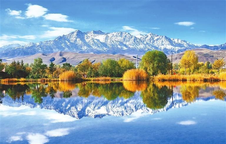 民樂縣西區(qū)公園層林盡染,在雪山的映襯下美不勝收。新甘肅·甘肅日報通訊員 王曉涇