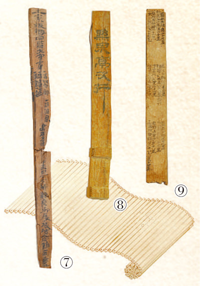 圖⑦⑧⑨:懸泉置遺址出土漢簡。其中,圖⑦為郵書刺刻齒簡。甘肅簡牘博物館供圖
