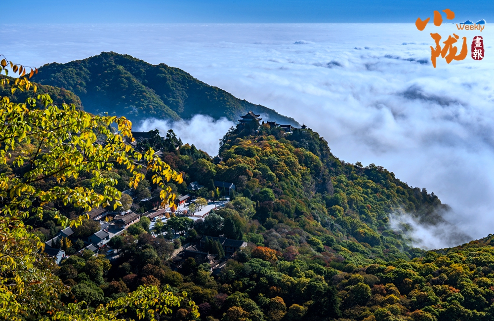 一葉知冬,遍地金黃。五彩斑斕的林木與古香古色的建筑、遠(yuǎn)處的山巒云霧相映成趣,盡顯詩意之美。