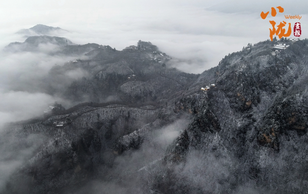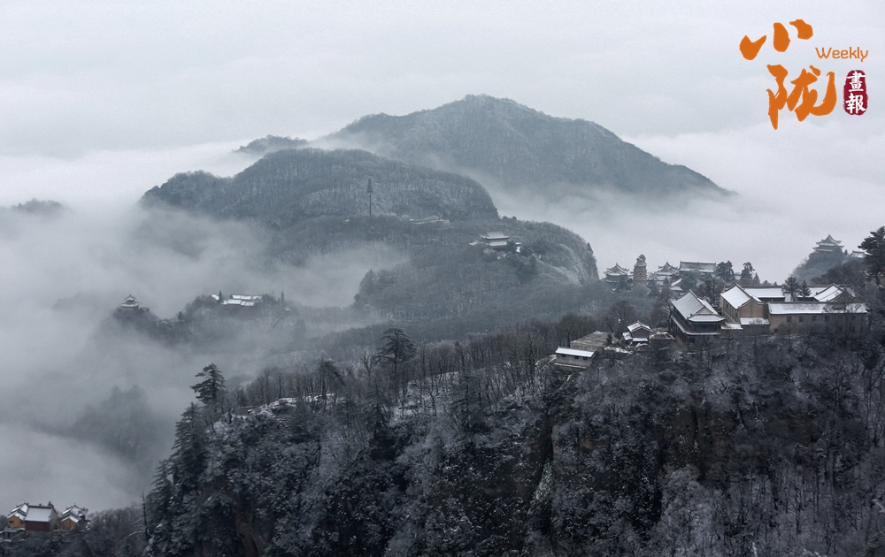 古建筑群在山雪映襯下,更顯古樸、神秘,常青樹木為冬日增添了生機(jī)。