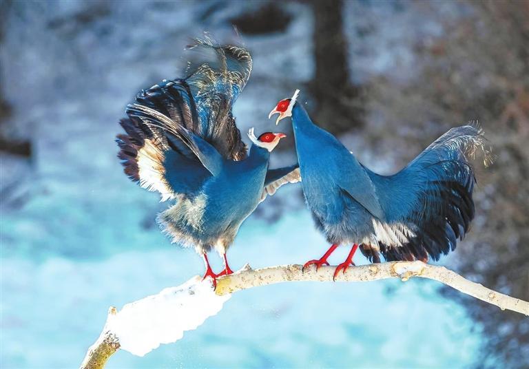 藍(lán)馬雞是珍稀名貴的禽類,頭側(cè)緋紅,耳羽簇白色、突出于頸部頂上,通體藍(lán)灰色,中央尾羽特長(zhǎng)而翹起,尾羽披散下垂如馬尾,故名藍(lán)馬雞。冬日里,藍(lán)馬雞成群飛落山腳覓食,藍(lán)羽丹頂行走在雪地上格外搶眼。數(shù)量繁多的藍(lán)馬雞是祁連山野生山地雞的“顏值擔(dān)當(dāng)”。覓食時(shí),藍(lán)馬雞常用爪刨挖林中空地苔蘚和林緣草地,尋找掉落的云杉種子。刨食的過(guò)程會(huì)讓土壤松動(dòng),便于種子生根發(fā)芽,促進(jìn)林區(qū)植物天然更新。