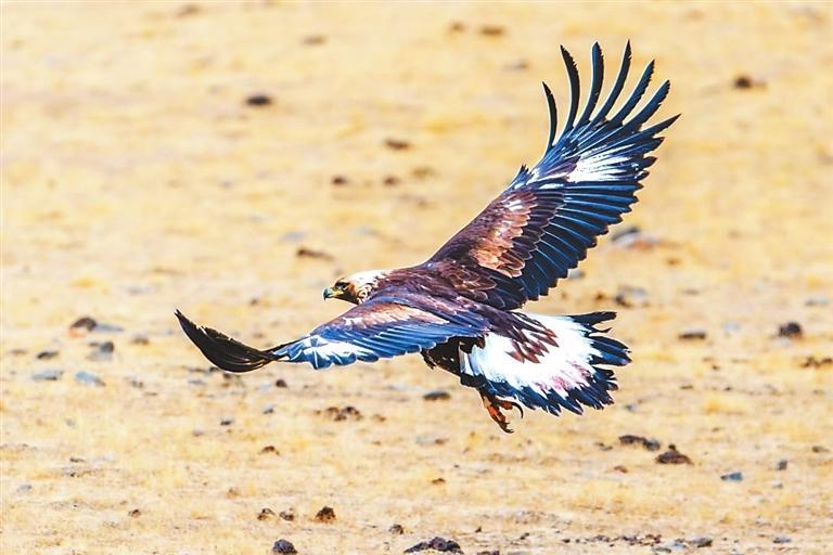 金雕以其卓越的捕獵技巧和優(yōu)雅的飛行姿態(tài)而聞名,主要棲息于高山草原、森林及河谷地帶。在祁連山遼闊的草原之上,金雕展開(kāi)它那寬闊且有力的雙翅,在藍(lán)天之中肆意翱翔。陽(yáng)光傾灑下來(lái),深褐色的羽毛閃爍著如同金屬般耀眼的光澤,猶如披上了一件堅(jiān)不可摧的鎧甲,威風(fēng)凜凜。它那犀利的眼神,仿佛能夠穿透重重迷霧,洞察這片廣袤土地上的每一個(gè)細(xì)微變化,盡顯王者風(fēng)范。它身姿雄偉而威嚴(yán),宛如一位至高無(wú)上的王者,向整個(gè)世界展示著它那不容小覷的力量與威嚴(yán),默默地守護(hù)著這片廣袤無(wú)垠的草原天地。