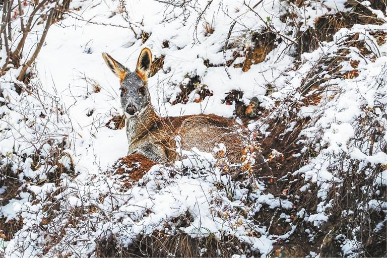 攝影師鏡頭下,一只馬麝安然臥在雪地上,它的耳朵偶爾會(huì)輕輕抖動(dòng)一下,像是在用心傾聽(tīng)著風(fēng)中傳來(lái)的細(xì)微聲響。它優(yōu)美的身形與周?chē)木吧昝廊诤显谝黄穑瑢庫(kù)o而祥和。