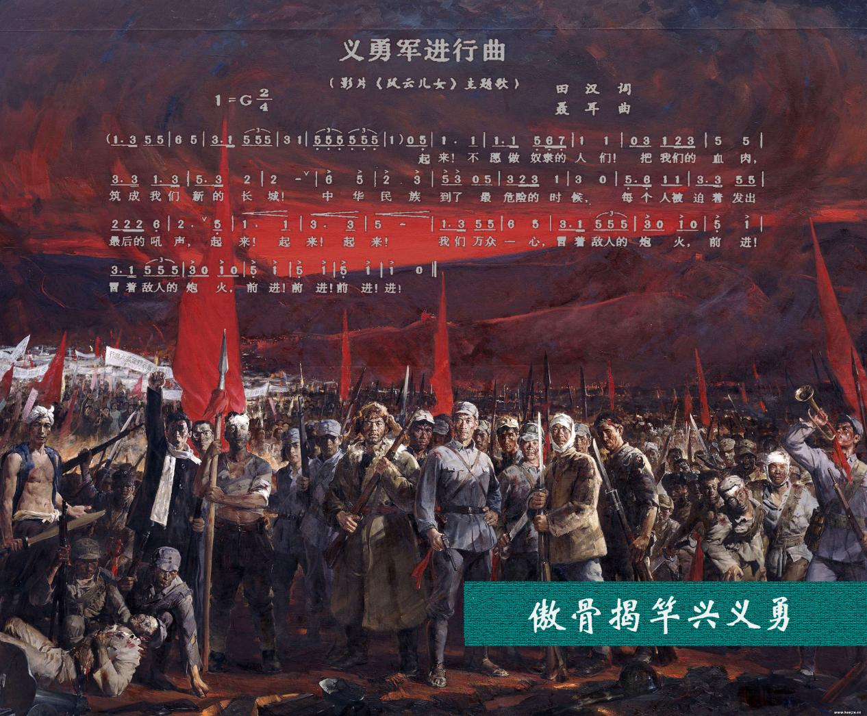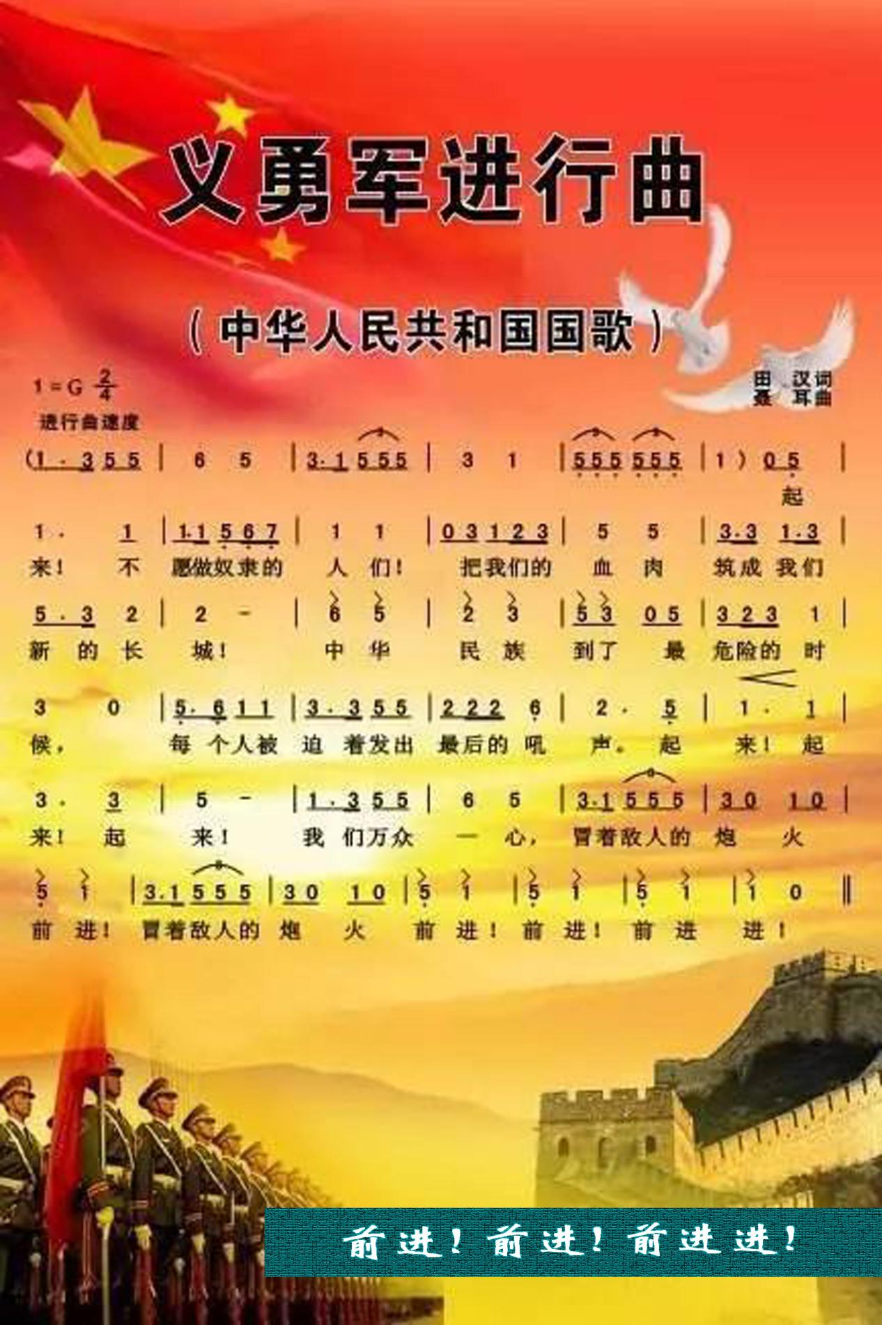 ⑧前進(jìn)!前進(jìn)!前進(jìn)進(jìn)!:《義勇軍進(jìn)行曲》這一段歌詞是作曲家聶耳改定的。為了使歌曲曲調(diào)和節(jié)奏更加有力,聶耳把田漢原來的“我們?nèi)f眾一心,冒著敵人的飛機(jī)大炮前進(jìn)。前進(jìn)!前進(jìn)!前進(jìn)!”改為“我們?nèi)f眾一心,冒著敵人的炮火,前進(jìn)!冒著敵人的炮火,前進(jìn)!前進(jìn)!前進(jìn)進(jìn)!”全國(guó)政協(xié)委員、國(guó)家一級(jí)指揮、解放軍軍樂團(tuán)前團(tuán)長(zhǎng)于海曾談到:“前進(jìn),前進(jìn),前進(jìn)進(jìn)!”這七個(gè)字堪稱國(guó)歌的點(diǎn)睛之筆。“前進(jìn)進(jìn)”的節(jié)奏感,凸顯了國(guó)歌精神的進(jìn)行時(shí)態(tài)。正是這種精神一直在指引我們,激勵(lì)著我們。