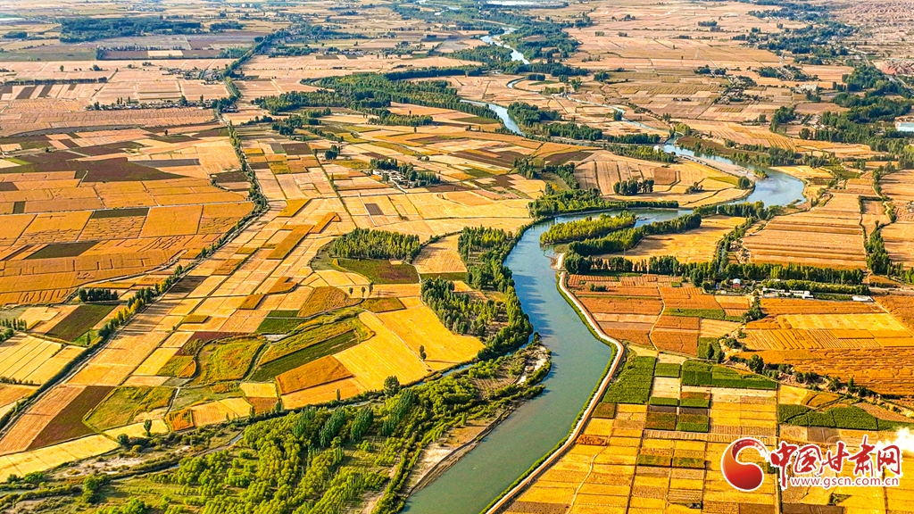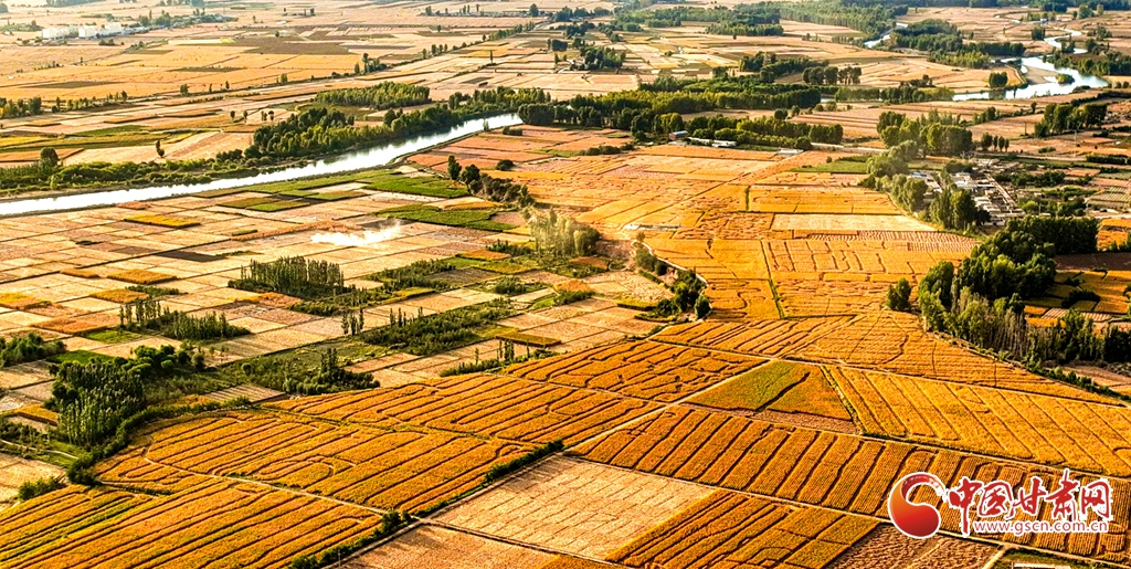 9月26日傍晚,夕陽映照下的黑河張掖臨澤縣鴨暖鎮(zhèn)段,蜿蜒流淌的河水與兩岸鋪滿金色的大地交相輝映,盡顯盎然生機,共同勾勒出一幅金秋豐收的壯美畫卷。