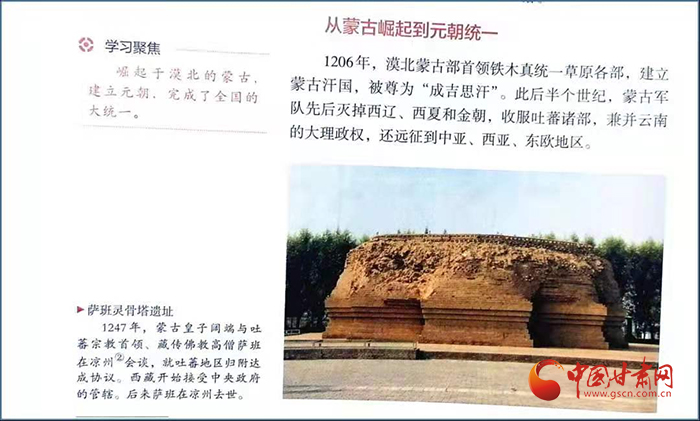 在高一歷史課本第56頁中外歷史綱要(上)第三單元有一段記錄“涼州會談”的簡要文字:“1247年,蒙古皇子闊端與吐蕃宗教首領、藏傳佛教高僧薩班在涼州會談,就吐蕃地區(qū)歸附達成協(xié)議。西藏開始接受中央政府的管轄。后來薩班在涼州去世。”文字右上角是一張薩班靈骨塔遺址配圖。