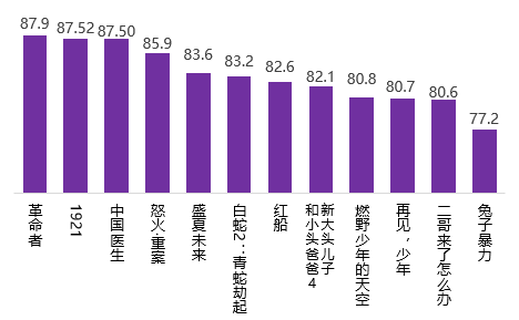 調(diào)查顯示,《革命者》《1921》《中國(guó)醫(yī)生》三部影片的滿(mǎn)意度得分分別為87.9分、87.52分、87.50分,分列2021年暑期檔影片滿(mǎn)意度排序的前三位。動(dòng)作片《怒火·重案》、青春片《盛夏未來(lái)》和動(dòng)畫(huà)片《白蛇2:青蛇劫起》滿(mǎn)意度居檔期第4至6位。