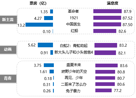 2021年暑期檔不同類(lèi)型/題材影片滿(mǎn)意度及票房對(duì)比