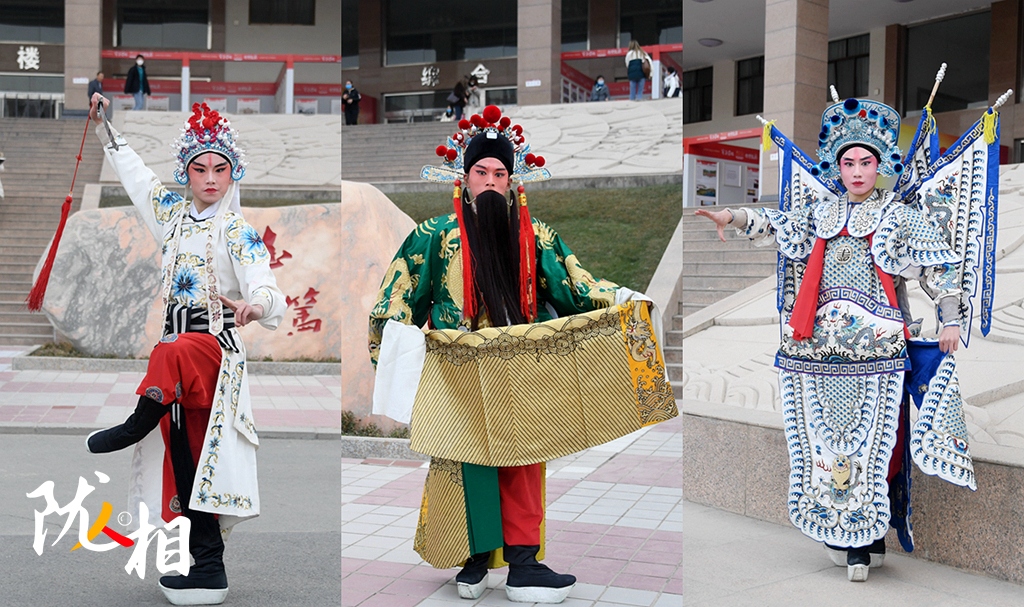 戲曲專業(yè)的學(xué)生戴著金龍同學(xué)制作的盔頭扮演不同的角色(拼版圖片)
