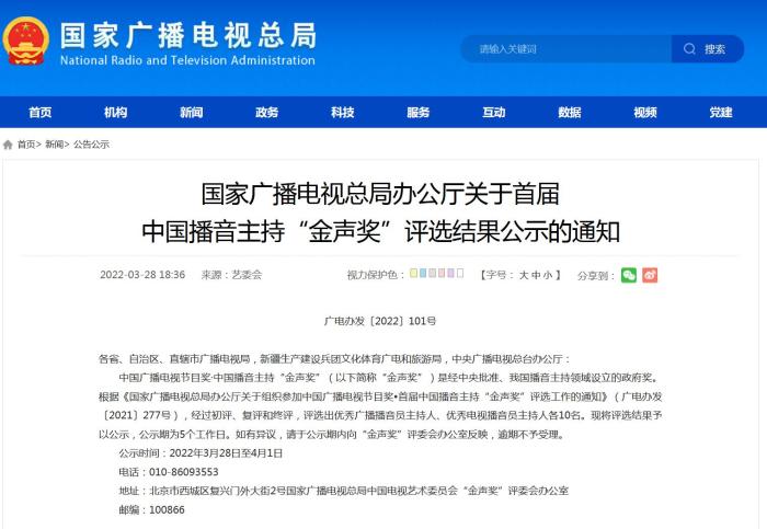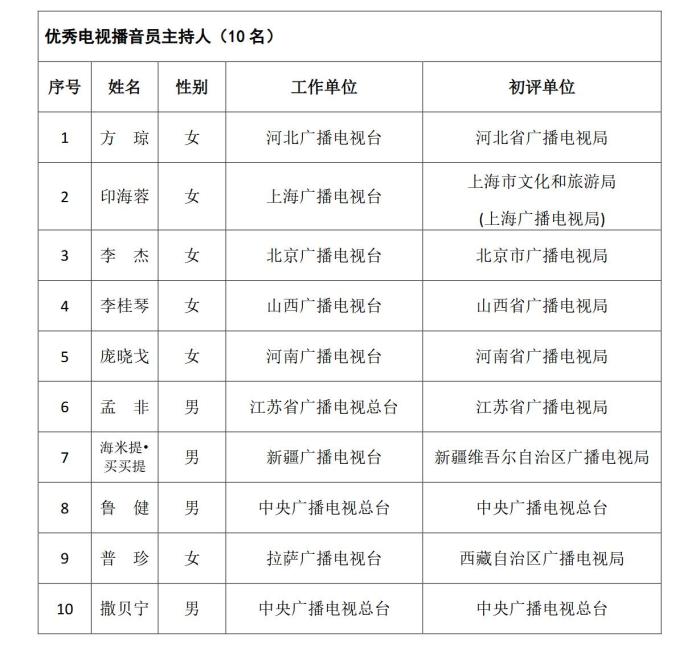《通知》指出,根據(jù)《國(guó)家廣播電視總局辦公廳關(guān)于組織參加中國(guó)廣播電視節(jié)目獎(jiǎng)•首屆中國(guó)播音主持“金聲獎(jiǎng)”評(píng)選工作的通知》(廣電辦發(fā)〔2021〕277號(hào)),經(jīng)過(guò)初評(píng)、復(fù)評(píng)和終評(píng),評(píng)選出優(yōu)秀廣播播音員主持人、優(yōu)秀電視播音員主持人各10名?,F(xiàn)將評(píng)選結(jié)果予以公示,公示期為5個(gè)工作日。