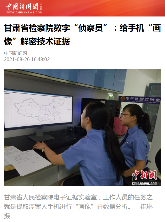 2021年8月26日,中國新聞網(wǎng)發(fā)布新聞《甘肅省檢察院數(shù)字“偵察員”:給手機“畫像”解密技術證據(jù)》。
