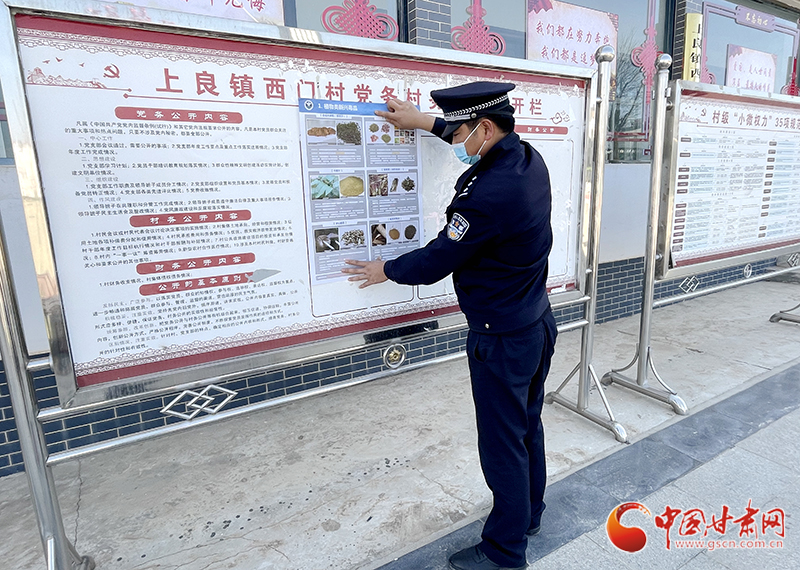 上良派出所社區(qū)民警在村務公開欄張貼禁毒宣傳海報