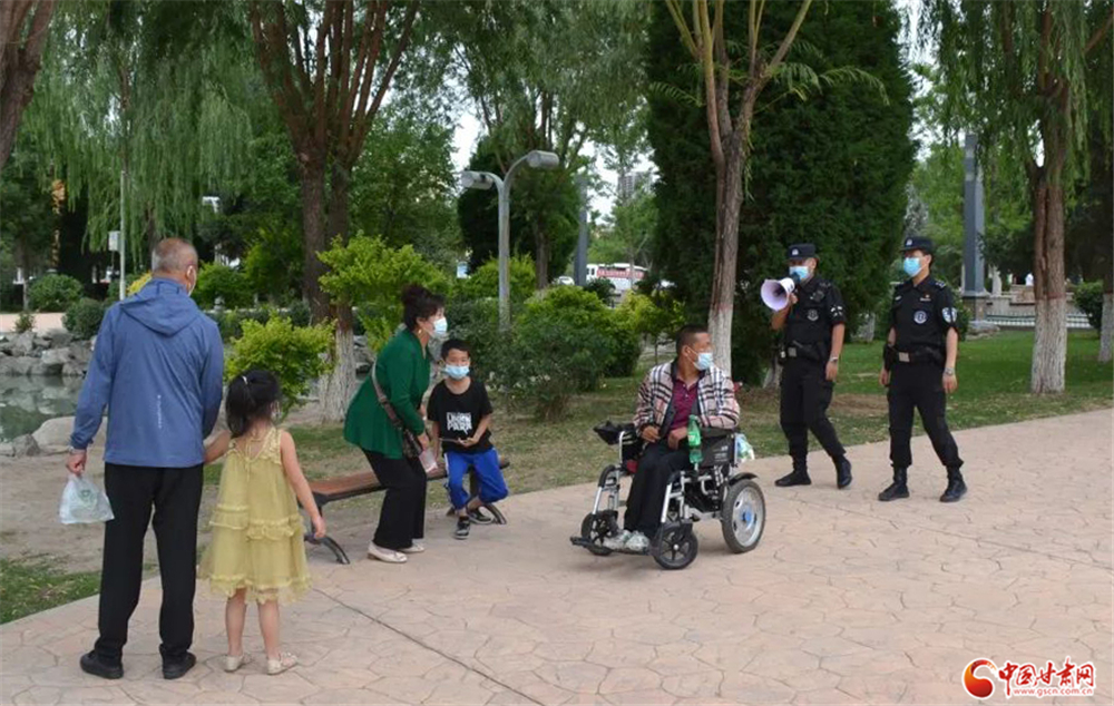 永登公安巡邏特警隊(duì)員在公園等公共場(chǎng)所手持小喇叭勸導(dǎo)群眾戴口罩少聚集不出門。永登縣局 徐大明/攝