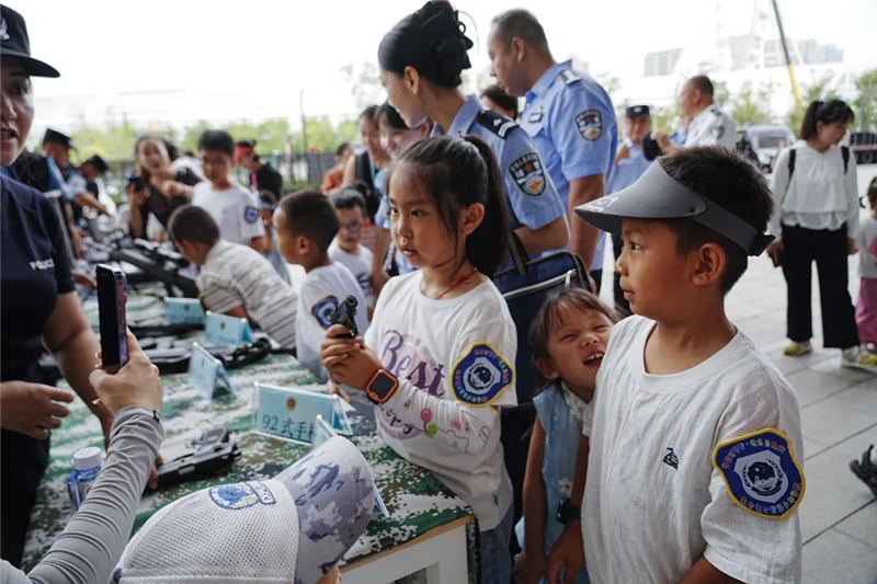 帶著興奮和期待,小朋友們的警營探索之旅開始了!在奧體中心警務站和警航作戰(zhàn)單元,他們沉浸式參觀了現(xiàn)代警務工作和警用無人機的指揮調度,直觀了解了公安工作的日常場景。另一邊,小朋友們在民警的指導下,一個個親手拿著警用武器裝備零距離“拍照打卡”,“這個好酷!”“看我的!”小朋友們的驚嘆聲此起彼伏。