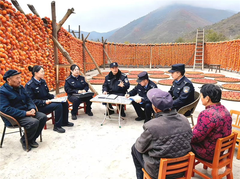 ▲舟曲縣公安局城關(guān)派出所民輔警深入轄區(qū)柿子晾曬場和柿子收購點,開展反詐宣傳活動。(朱彤 攝)