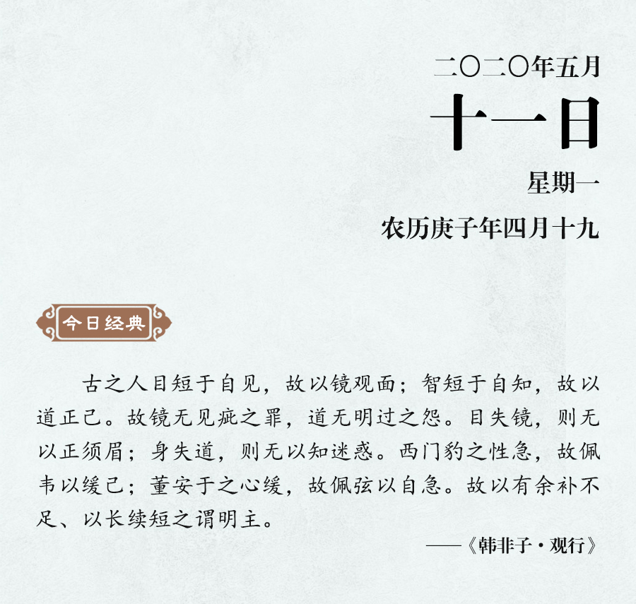 古代的人因?yàn)檠劬Σ荒芸匆?jiàn)自己的臉,所以用鏡子觀察面容;因?yàn)橹腔鄄蛔阋园l(fā)現(xiàn)自己的過(guò)失,所以用道端正自己。所以鏡子不會(huì)因?yàn)檎粘鲥e(cuò)誤而被怪罪,道不會(huì)因?yàn)槭惯^(guò)錯(cuò)公開而遭到怨恨。眼睛失去鏡子,就不能夠端正面容;人失去道,就無(wú)法知道是非對(duì)錯(cuò)。西門豹性子急躁,所以佩戴柔韌的皮帶,提醒自己應(yīng)該從容沉著;董安于性格溫緩,所以佩戴繃緊的弓弦,提醒自己應(yīng)該保持警醒。因此用有余補(bǔ)齊不足,用其所長(zhǎng)來(lái)續(xù)接其短,這就叫明主。