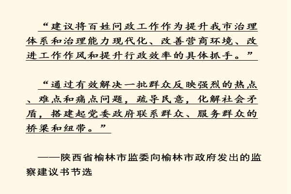 2019年12月6日,榆林市監(jiān)委制發(fā)的《關(guān)于解決百姓問(wèn)政工作中存在問(wèn)題的建議》的監(jiān)察建議書送達(dá)榆林市政府,并交于市長(zhǎng)本人。