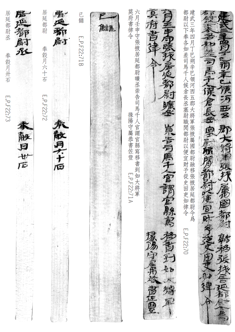 1974年8月出土于甲渠候官遺址第22號(hào)房址內(nèi)。簡(jiǎn)冊(cè)由10枚簡(jiǎn)組成,每簡(jiǎn)長(zhǎng)22.8厘米,前兩簡(jiǎn)寬2.5厘米,其余8簡(jiǎn)寬1.4厘米。全文200字。內(nèi)容為東漢建武三年(公元25年)竇融統(tǒng)治河西期間留下的一份完整的財(cái)政文書(shū)。簡(jiǎn)文是關(guān)于居延都尉府吏員奉谷標(biāo)準(zhǔn)的通知,由領(lǐng)河西五郡大將軍張掖屬國(guó)都尉竇融幕府下發(fā),簡(jiǎn)言“如律令”可知其指令具有法律效力。
