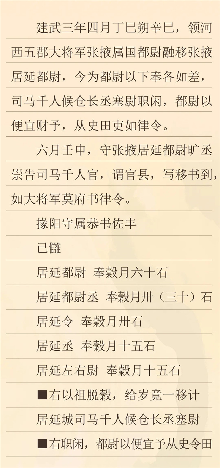 這封冊(cè)書(shū)記載了建武三年,竇融管轄河西時(shí)發(fā)布的一條關(guān)于都尉以下官吏奉谷等差的命令。根據(jù)竇融發(fā)布的新規(guī)定,我們可以看到,秩比二千石的居延都尉月奉谷僅為六十石,史書(shū)有“十斗一斛”及“十斗一石”的記載,此六十石即是六十斛,相比于史書(shū)記載中比二千石每月百斛的俸例要少,而其余官吏的俸祿也相應(yīng)要少,雖然漢代不同時(shí)期的官吏俸祿存在變化,但對(duì)比所見(jiàn)的這種情況,可能也跟兩漢之交戰(zhàn)亂頻仍的社會(huì)環(huán)境有重要關(guān)系。(李晶整理)