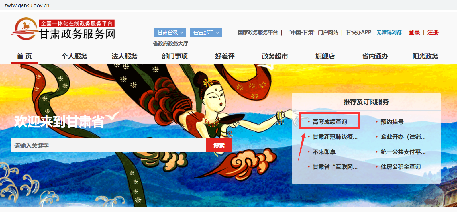 打開“甘肅政務(wù)服務(wù)網(wǎng)”https://zwfw.gansu.gov.cn/,在首頁“推薦及訂閱服務(wù)”欄目,點(diǎn)擊“高考成績(jī)查詢”進(jìn)入查詢頁面,輸入考生號(hào)、身份證號(hào)即可查詢。
