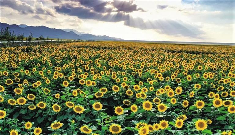 時(shí)下,位于白銀市景泰縣寺灘鄉(xiāng)境內(nèi)的永泰川戈壁灘,萬(wàn)畝滴灌的旱砂田里葵花盛開(kāi),斜陽(yáng)之下猶如一幅金色畫(huà)卷。