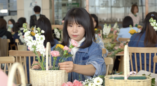 繁花似錦報春來,天姿國色抒情懷?;顒蝇F(xiàn)場花香四溢、芬芳溫馨,充滿著春天般的氣息,大家手捧鮮花,在花藝?yán)蠋煹闹v解下,開始學(xué)習(xí)各種鮮花所蘊(yùn)含的花語祝福和選花、裁剪、搭配、造型及養(yǎng)護(hù)等藝術(shù)插花技巧。隨后,女工們將原本普普通通的月季、康乃馨、蝴蝶蘭、滿天星、向日葵等多種花材修剪整枝,根據(jù)不同的色彩和形狀有層次地搭配在一起。通過精心構(gòu)思造型、發(fā)揮創(chuàng)意想象,有的注重意境創(chuàng)設(shè)追求,有的突出枝情花韻之趣,有的抒展自然樸實風(fēng)格……在細(xì)致地修飾和精心地創(chuàng)作下,一枝花、一棵草都變得詩情畫意和清新怡人,節(jié)日的喜慶氣氛瞬間升騰。