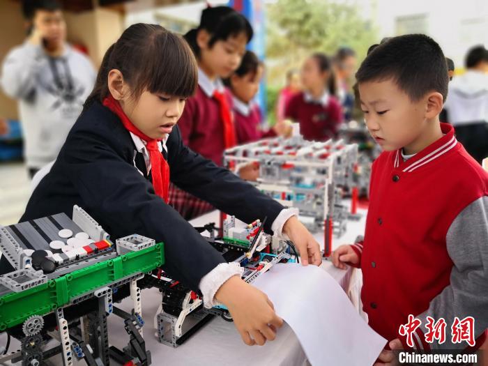 圖為蘭州市城關區(qū)青少年科技創(chuàng)新大賽上,用樂高創(chuàng)作的打印機打印圖畫吸引學生觀看。(資料圖)劉薛梅攝