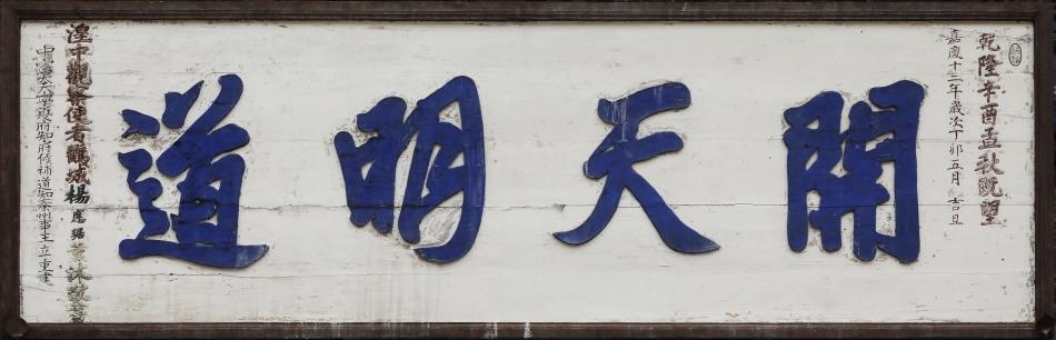 該匾懸于天水伏羲廟大門前牌坊正中。長3.5米,寬1.25米,厚0.12米。素邊,匾心白底藍字,上下款朱書。此匾有雙上款和雙下款。第一個上款為“乾隆辛酉孟秋既望”,下款為“湟中觀察使者遼海楊應琚薰沐敬書”;第二個上款為“嘉慶十二年歲次丁卯五月吉旦”,下款為“中憲大夫?qū)幭母蜓a知秦州事王公重建”。