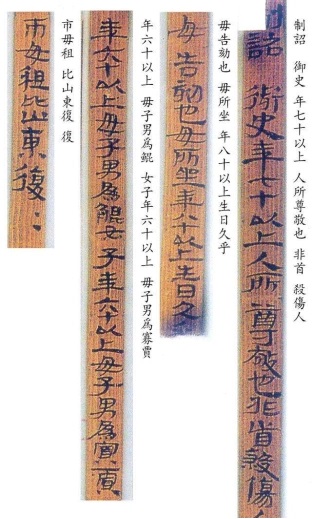 1981年出土于武威磨嘴子漢墓中的“王杖詔書令冊”簡則是關(guān)于古代敬老養(yǎng)老制度的法律法規(guī),堪稱古代“老年人權(quán)益保護(hù)法”。原簡背面有編號第一至第廿七,共27簡,但第15簡已缺失,余26簡首尾俱全。正面有556個字,雖歷經(jīng)千年,上面墨書的漢隸依然清晰可見。簡文內(nèi)容豐富,記載明確,既有撫恤鰥寡孤獨廢疾之人的具體做法,又有敬老養(yǎng)老高年賜王杖的明確規(guī)定。