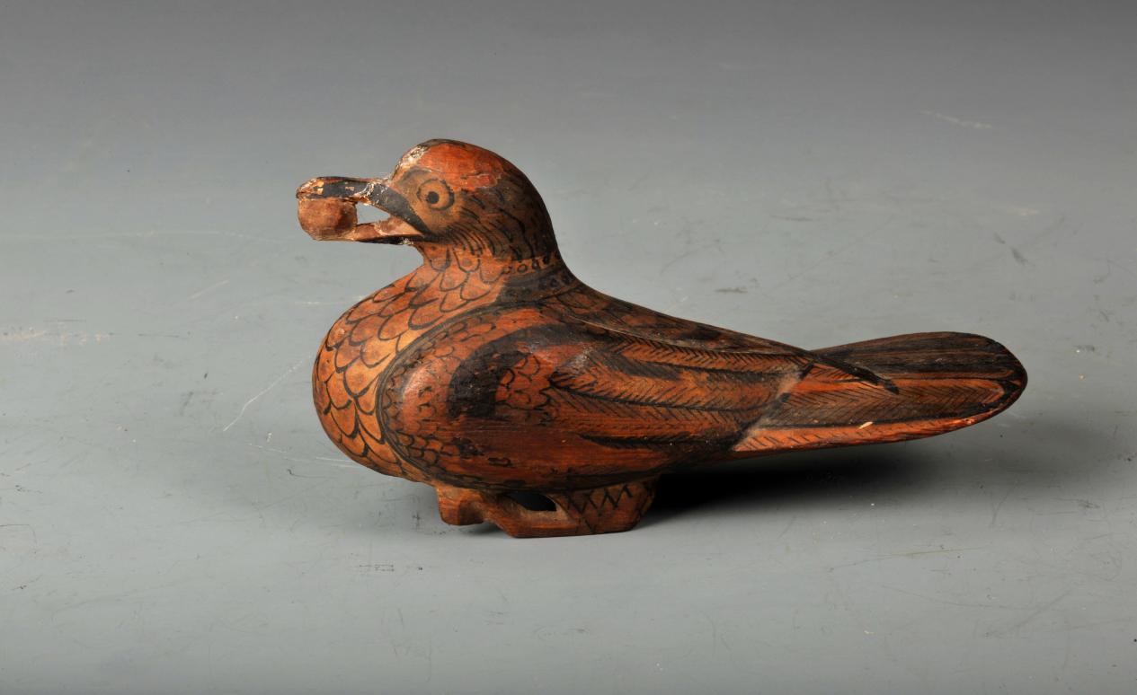 木鳩是王杖的杖首。在武威市博物館里,就有一件國寶級文物漢代彩繪漆木鳩:一只臥姿木質(zhì)鳩鳥,雙目平視,口中含物,兩翼收攏于背部,尾呈平行片狀,兩足曲伸,中有方形卯,為杖桿接榫處。通體墨彩繪制,從頸至腹繪魚鱗狀羽毛,兩翼及尾上部繪魚骨狀羽毛。《后漢書·禮儀志》中記載:“王杖長九尺,端以鳩鳥為飾。鳩者,不噎之鳥也。欲老人不噎。”,“鳩”同于漢字“九”,有九九長壽的寓意;鳩鳥被稱為不噎之鳥,表達(dá)了對老人吃飯不噎、身體康健的美好祝愿。