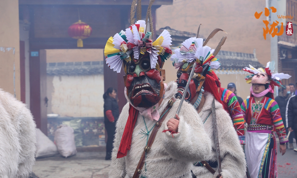 表演的隊(duì)伍圍著寨子挨家挨戶去跳,舞者至少三人,三人以上不限,皆頭戴面具,在“咚咚咚”的鼓聲和“哐哐哐”的鑼聲伴奏下激烈地跳躍,最后跳到田邊地角為止。