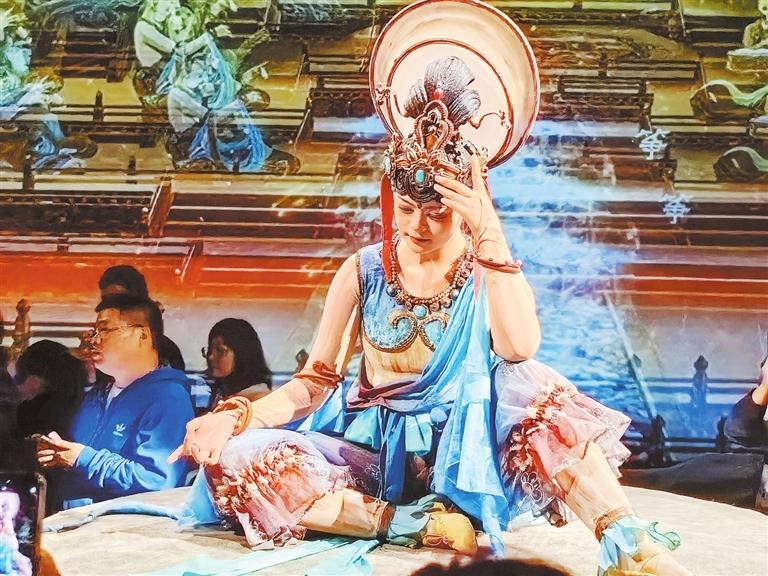 “真是一場(chǎng)酣暢淋漓的敦煌樂舞盛宴。雖然這趟旅程我們還沒有去敦煌莫高窟,但看罷這場(chǎng)演出,已經(jīng)對(duì)莫高窟壁畫有了初步的認(rèn)知。莫高窟壁畫的精華部分,借助高科技手段和演員的精彩演繹,在我們眼前立體延展開來,同時(shí)劇場(chǎng)內(nèi)大量復(fù)刻了佛龕、蓮花臺(tái)、藻井等特色形制,讓我們‘一眼入境’,帶我們走進(jìn)歷史深處,觸摸文明脈動(dòng)。”浙江游客王松攜家人觀看《樂動(dòng)敦煌》后,發(fā)出贊嘆。