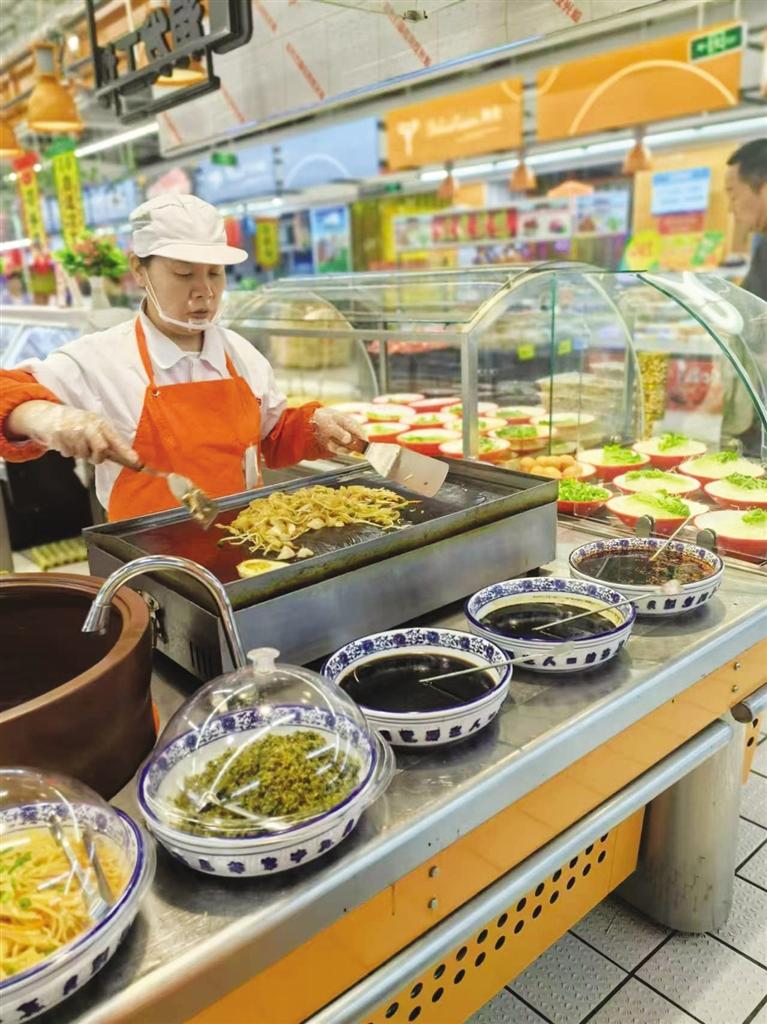 超市里的“平價食堂”,成為打造一刻鐘便民生活圈的重要載體。“超市周邊的居民、上班族、學生、酒店差旅客群的基礎比較大,所以增加快餐、堂食也是超市的一項便民舉措。”超市里升騰起的煙火氣,也讓超市的來客率明顯提升,“周末時,油條的銷量能達到1000根、豆腐腦能賣到500碗,不管是檔口、自助收銀機都有排隊的顧客。”