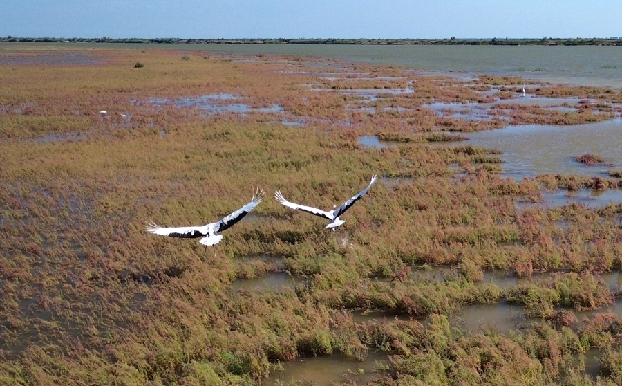 我們這里是中國東方白鸛之鄉(xiāng)、黑嘴鷗繁殖地,去年以來還新發(fā)現(xiàn)了火烈鳥、白鵜鶘、勺嘴鷸。”當?shù)刎撠熗窘榻B,這些年通過退耕還濕、退養(yǎng)還灘,推進濕地修復(fù),生態(tài)環(huán)境越來越好。