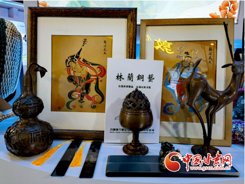 在甘肅館內(nèi)的林蘭銅藝展區(qū),白銀林蘭銅藝文化發(fā)展有限公司負(fù)責(zé)人馬艷萍一邊向觀(guān)展賓客介紹自己的產(chǎn)品,一邊向大家推介自己的家鄉(xiāng)—甘肅省白銀市。