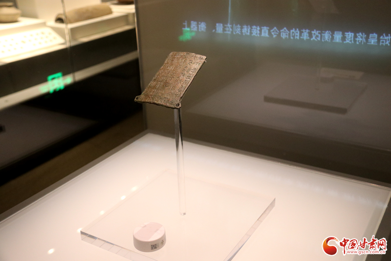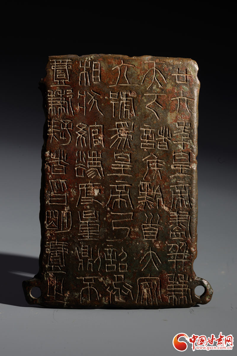 中國(guó)甘肅網(wǎng)9月14日訊(西北角·中國(guó)甘肅網(wǎng)記者 孫珩力)秦詔版,是指刻有秦始皇或秦二世統(tǒng)一度量衡詔書(shū)的銅版,有的鑲在鐵權(quán)、銅權(quán)上;有的四角有孔,用以釘在木頭的量器上。目前我國(guó)出土的刻有秦始皇詔文的遺物有銅橢量、銅錢(qián)等,不僅數(shù)量多而且分布也廣,而像這樣把詔文刻在銅版上的詔版形式在全國(guó)極為罕見(jiàn),鎮(zhèn)原縣博物館收藏的就是其中之一,可謂稀世珍品。