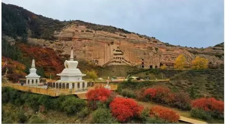 18日上午,迎著耀眼的晨光,采訪團成員乘坐大巴車來到了集自然風光、石窟藝術(shù)、民族風情、宗教文化于一體的肅南馬蹄寺。馬蹄寺是河西走廊著名的佛教勝地,石窟群開鑿于十六國北涼時期,距今約1600年的歷史,是絲綢之路上至關(guān)重要的歷史文化瑰寶,也是我國早期石窟的杰出代表。秋日的馬蹄寺,秋高氣爽,景色宜人,遠遠看去,紅綠相間,層林盡染,大家行走在落葉飄零的山間小路上,對這座建在懸崖峭壁之上、將棧道鑲嵌在山體之內(nèi)的石窟充滿了好奇。
