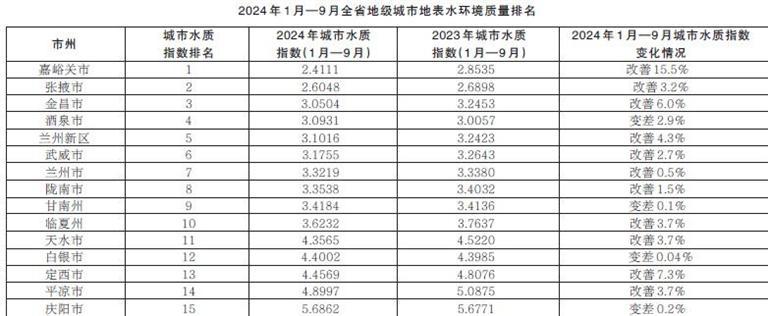 省生態(tài)環(huán)境廳發(fā)布2024年1月—9月全省14個地級城市及蘭州新區(qū)地表水環(huán)境質(zhì)量排名情況