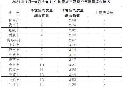 2024年1月—9月,全省14個地級城市環(huán)境空氣質(zhì)量綜合排名由高到低分別為:甘南州、隴南市、張掖市、酒泉市、嘉峪關市、慶陽市、天水市、武威市、定西市、金昌市、臨夏州、平?jīng)鍪?、白銀市、蘭州市。