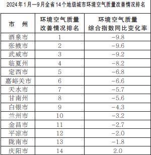 2024年1月—9月,全省14個地級城市環(huán)境空氣質(zhì)量改善情況排名由好到差分別為:酒泉市、張掖市、武威市、臨夏州、定西市、嘉峪關市、天水市、甘南州、白銀市、蘭州市、金昌市、平?jīng)鍪?、隴南市、慶陽市。