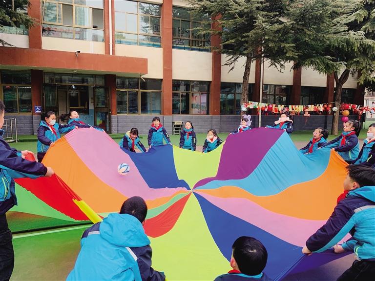 記者在校園里看到,在大腳板上,同學(xué)們齊心協(xié)力,喊著口號(hào)前進(jìn);時(shí)空隧道里,大家歡聲笑語(yǔ),享受著穿越的樂(lè)趣;車輪滾滾、彩虹傘、袋鼠跳、擲沙包……每一項(xiàng)活動(dòng)都讓孩子們樂(lè)此不疲。