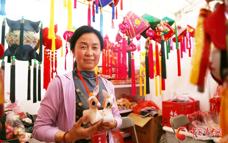 在展館的一角,來自慶城的一位香包繡制商戶喬志梅正在現場推銷著自己帶來的產品。其中驢形香包最為顯眼,據她介紹,驢形香包多數呈現黑色,有忠厚、老實之寓意,在當地極受喜愛。但她制作的驢形香包,通體為白色,鬃毛為粉色,驢耳一上一下較為可愛俏皮。