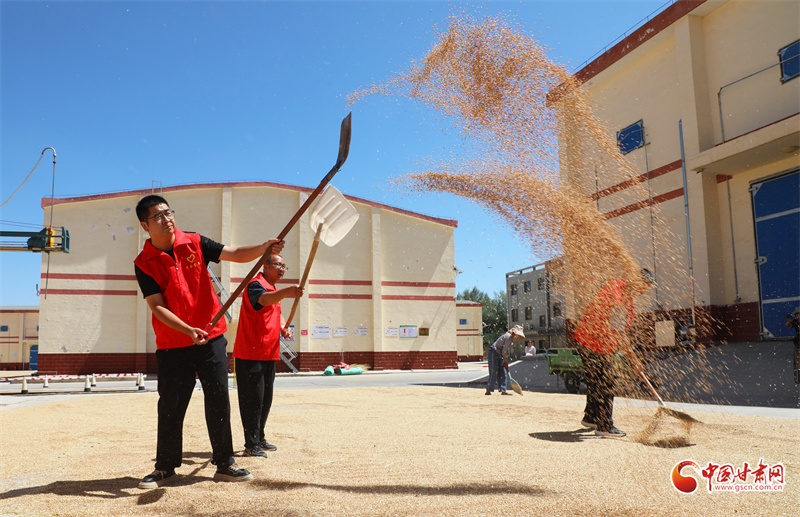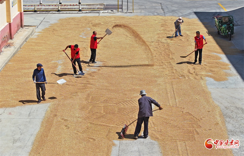 8月19日,在民樂縣糧食產(chǎn)后服務(wù)中心的曬場上,糧農(nóng)們正在搶抓晴好天氣翻曬小麥。